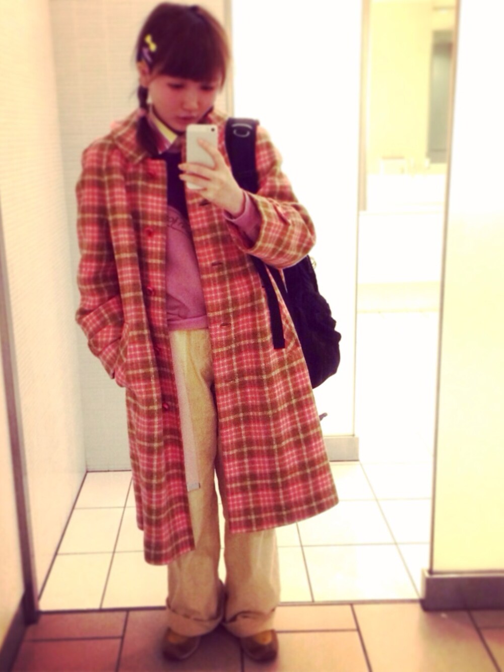 イエロー系のスニーカーを着用したレディースの冬コーディネートの1枚目の写真