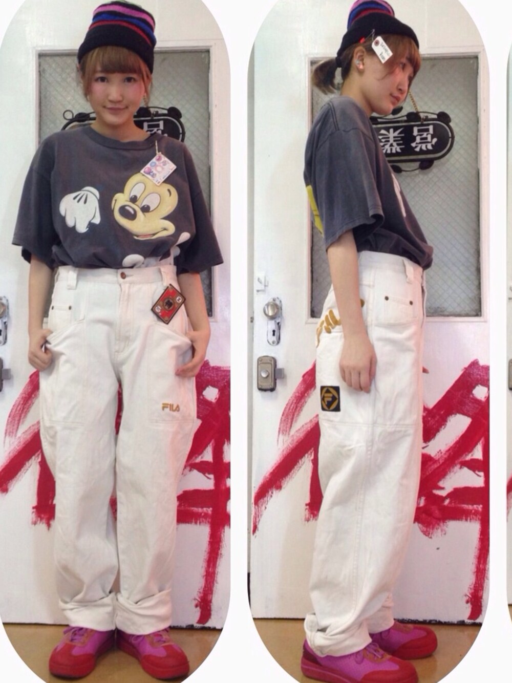 雀蜂スタイル!💟 ニット帽 used Tシャツ oldミッキー used パンツ FILA used シューズ ICECREAM used シンプルビッグサイズの組み合わせで メンズっぽく🐣✨