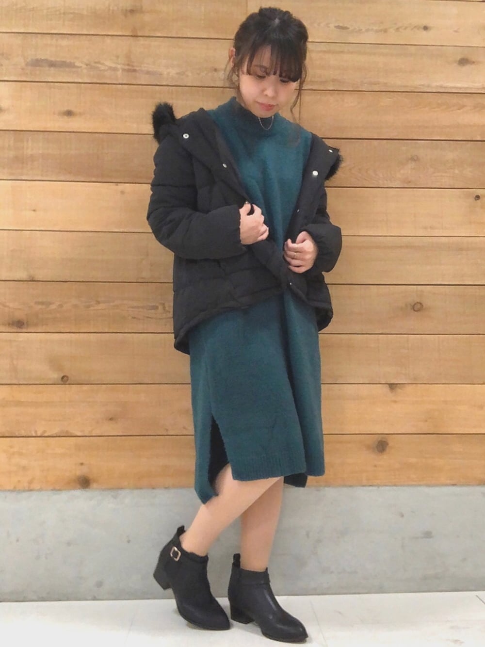 1月🎍 勝手にニットワンピ特集 今日はブルーグリーン 綺麗な色味のニットワンピには さっとトレンドの中綿ブルゾンを🔋 大人っぽさとこなれ感がミソ!