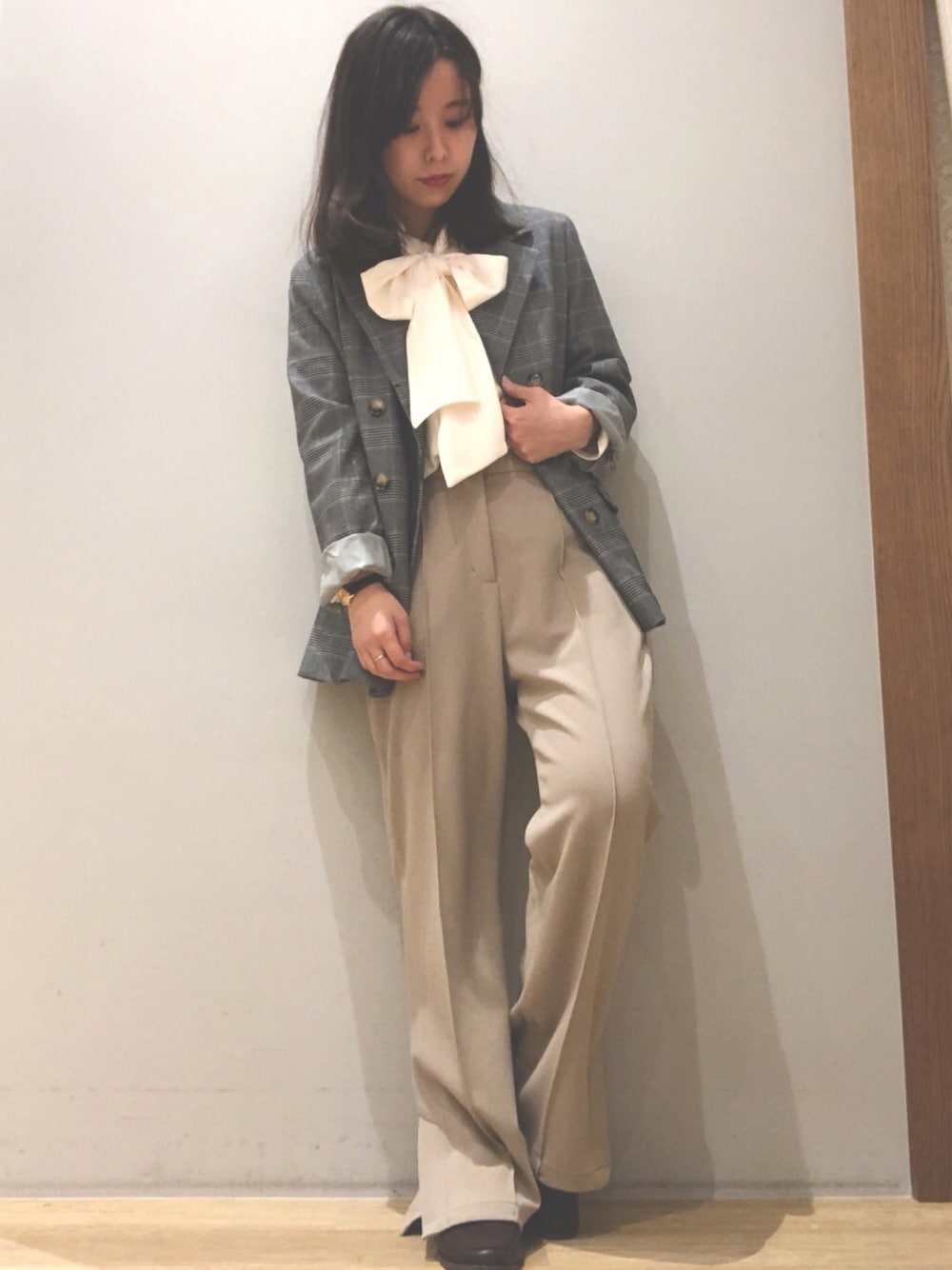 2月 ボウタイブラウスがかわいい😍 チェックのジャケットはいろんな着方ができそう🌿