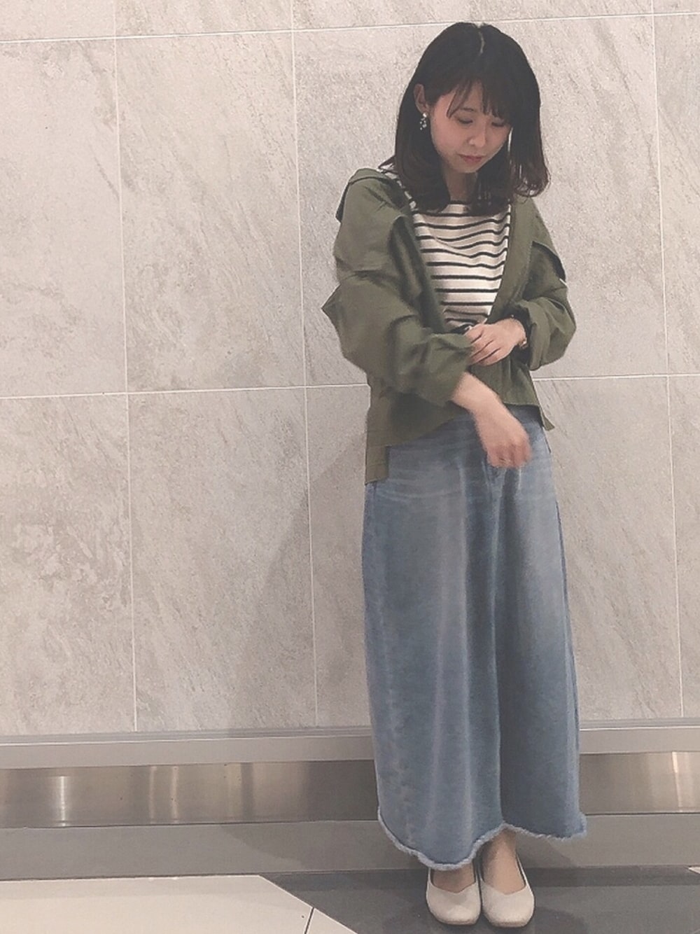 【4月】 ご覧いただきありがとうございます☀️ カーキのブルゾンは軽くて春アウターにぴったり❣️袖を折ったり着崩すとこなれ感が出て🙆♀️ デニムスカートは長めの丈が大人カジュアルです🌿