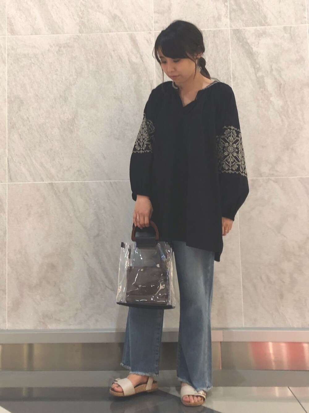ご覧頂きありがとうございます👨🏻 ふわっとエスニック風の刺繍がかわいい 大人カジュアルコーデです 小物は涼しそうなクリアバッグ👜