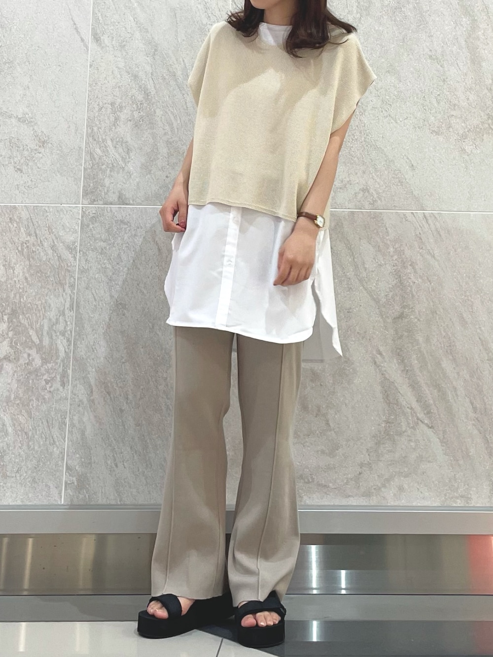 ご覧いただきありがとうございます🌿 セットアイテムのレイヤードコーデ◎ 着回し力高いニットベストとシャツドッキングのノースリーブトップス これだけでコーデが完成します! 新作のニットパンツも楽ちんながら美シルエット✨ くすみカラーでコーデに馴染む