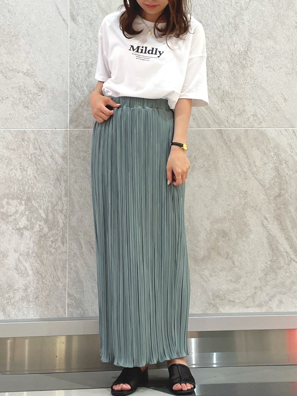 ご覧いただきありがとうございます◎ プリーツスカートのシンプルコーデ🤍 スカートの色が綺麗です