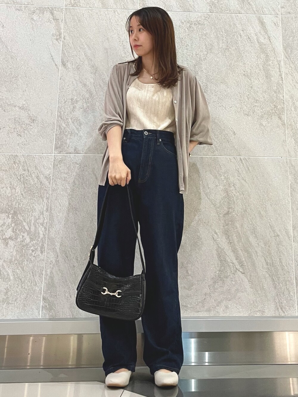 ご覧いただきありがとうございます◎ カーディガンをサラッと羽織って シンプルカジュアルコーデです🌿 ワンハンドルのショルダーバッグは程よい光沢感のある合皮素材でコーデ全体を締めてくれます☕️