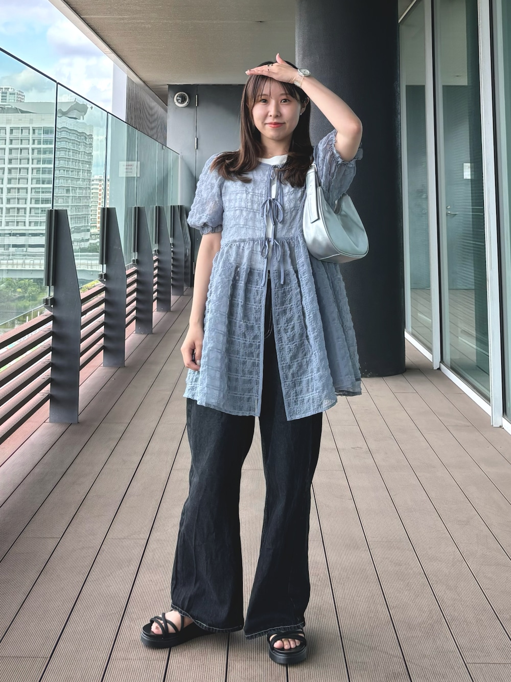 身長152cm トップス:普段S~Mサイズ ボトムス:普段Sサイズ ご覧いただきありがとうございます♪ 今人気のシアーチュニックをブラックデニムと合わせました! チュニックは前後どちらも着ていただけます🌻