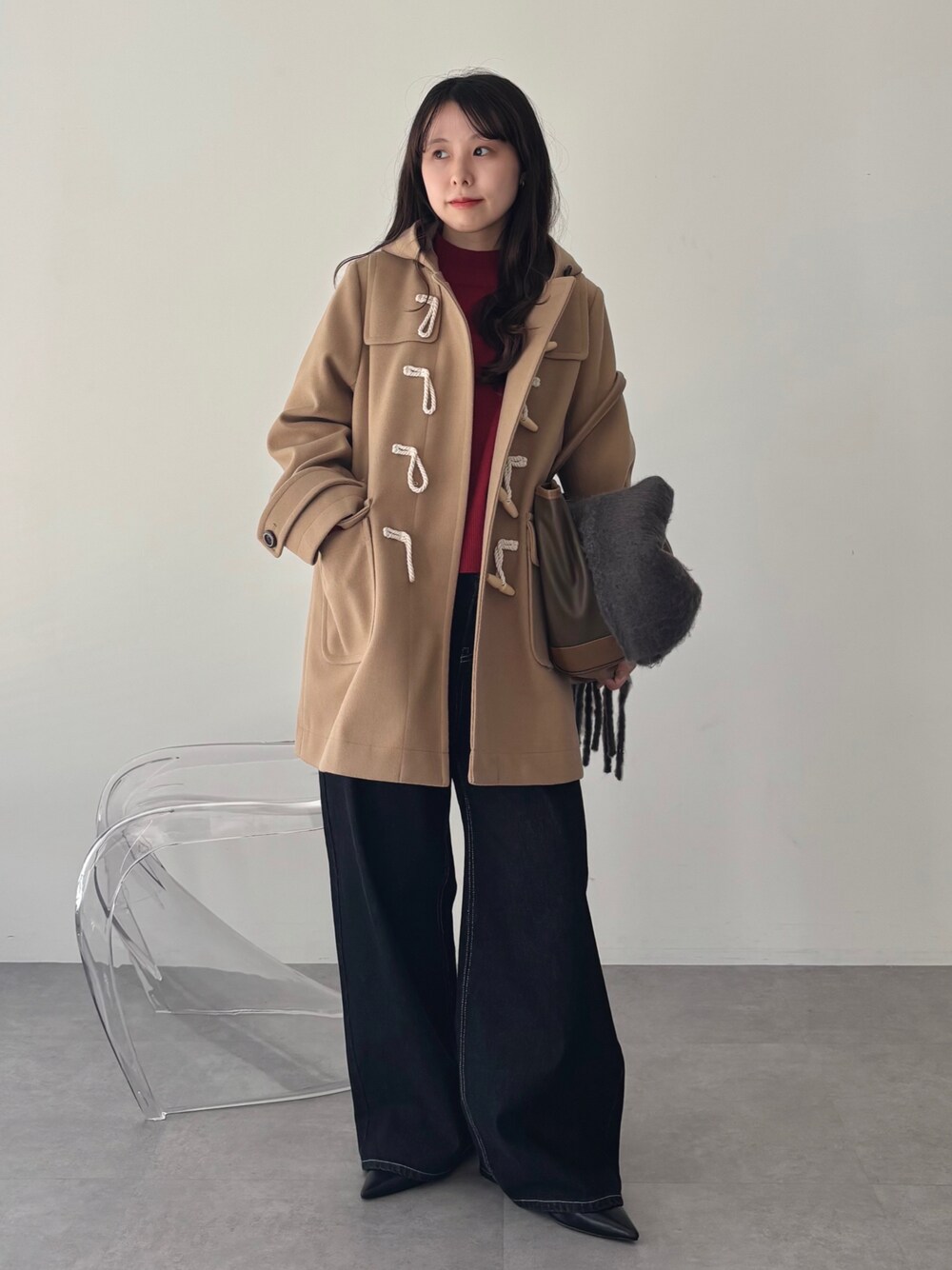 ご覧いただきありがとうございます🌼 ダッフルコートの大人カジュアルコーデです 赤のニットを差し色にしてみました◎ パンツもトレンドなワイドシルエットをデニムも濃いめを選んできちんと感と秋冬らしさをプラス!