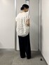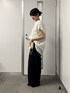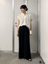 ブラウスはオフホワイト、パンツはブラックの36サイズ着用です。 一気に着映えしてくれるブラウスは一枚あると便利です。