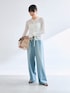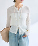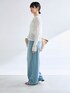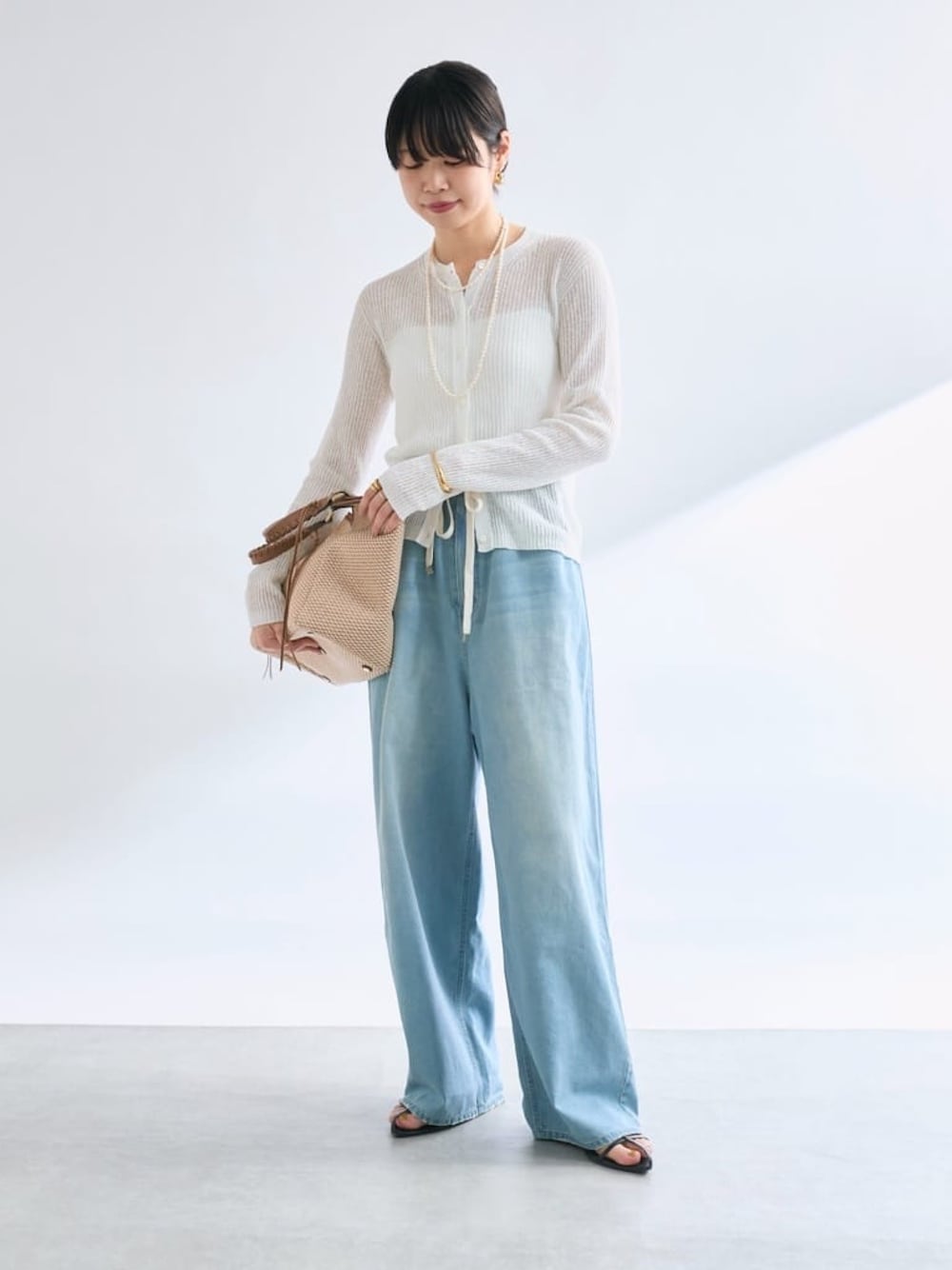 SHIHOさんコラボのカーディガンは、コンパクトでスッキリとしたシルエットがかわいいアイテム。 デニムは38サイズ着用。ゆったりしているためウエストの紐はぎゅっと閉めています。 マイサイズは36です