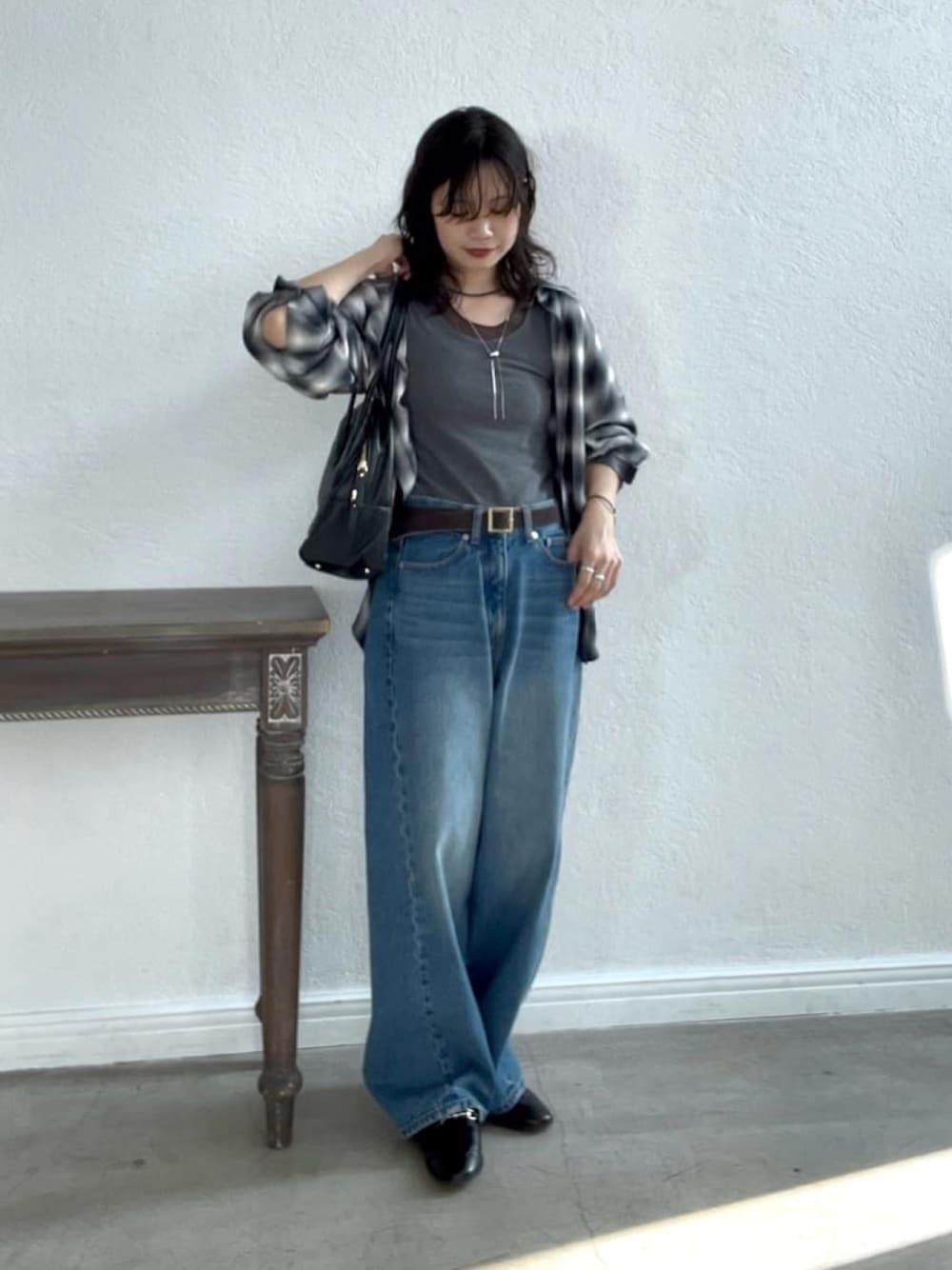1枚でも羽織でも、腰巻きでワンポイントとしても着れるチェックシャツは使い勝手抜群! デニムコーデの時はカジュアルすぎないように、皮小物や落ち着いたカラーでまとめると◎