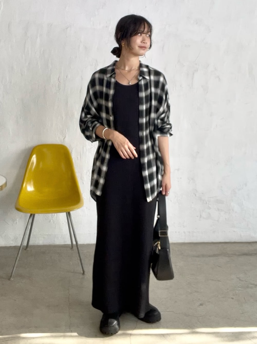 やわらかく落ち感のあるチェックシャツは、肌あたりも心地よいアイテム。 ワンピースと合わせるとカジュアルすぎないシンプルコーデになりおすすめです。