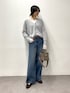 明るい色味のカーディガンは、細かなシルバーのラメ入りで程よく着映えするアイテム。 デニムと合わせてもカジュアル過ぎないように、皮小物でまとめました。