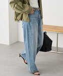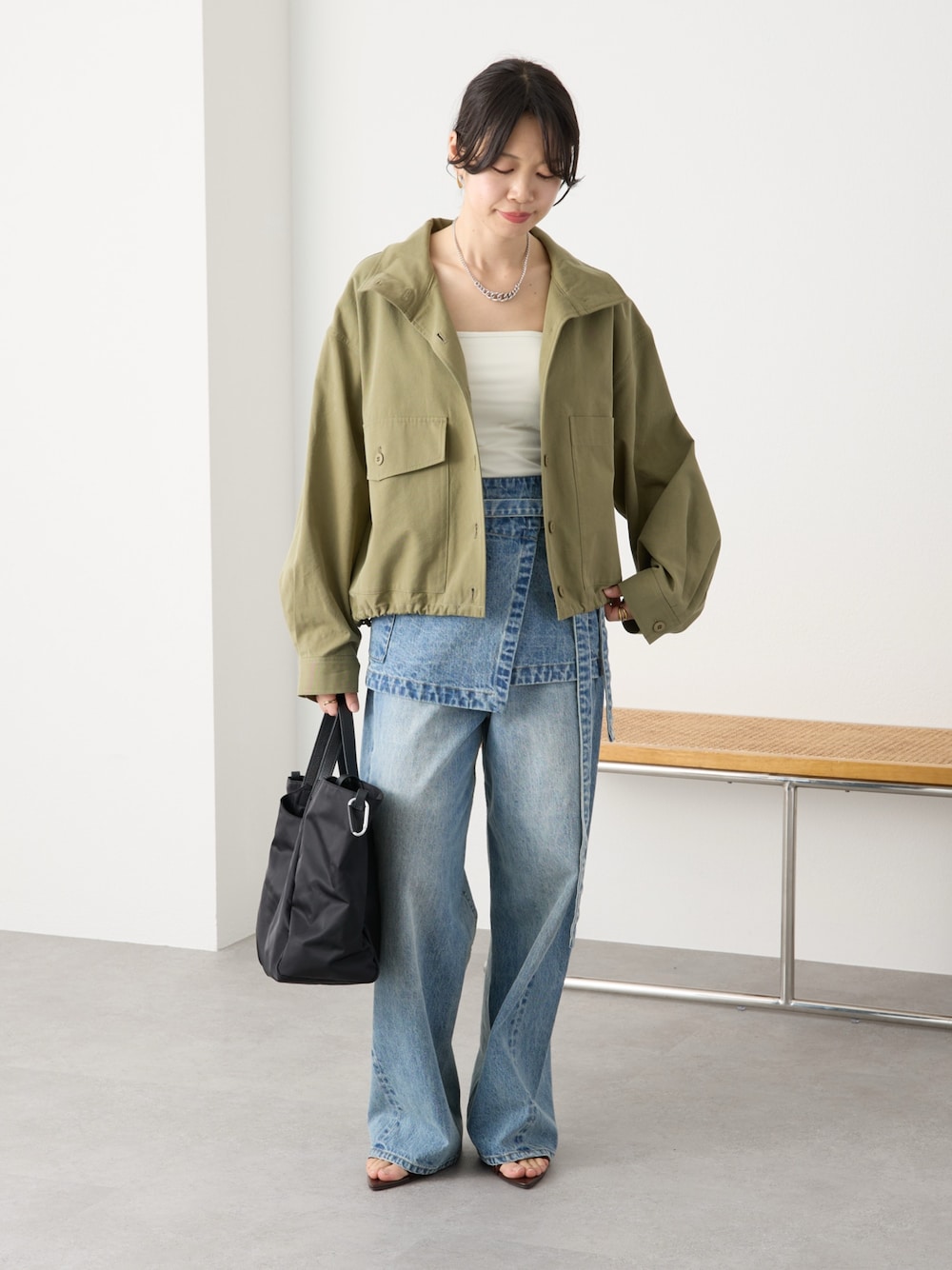 シンプルながらも小技の効いたコーデ。 デニムエプロンはつけるだけで一気にこなれ感の出るおしゃれアイテムです。