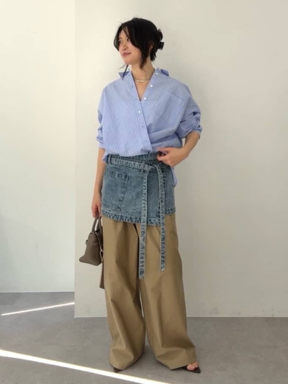 デニムエプロンを足すだけで一気に雰囲気チェンジができておすすめ。 チノパンは38サイズ着用。 わたしはウエストが落ちてしまうためヒールでも少し引きずってしまいました。ジャストウエストだとギリギリ床につかないくらいの丈感。 似たような体格の方は36サイズもおすすめです。