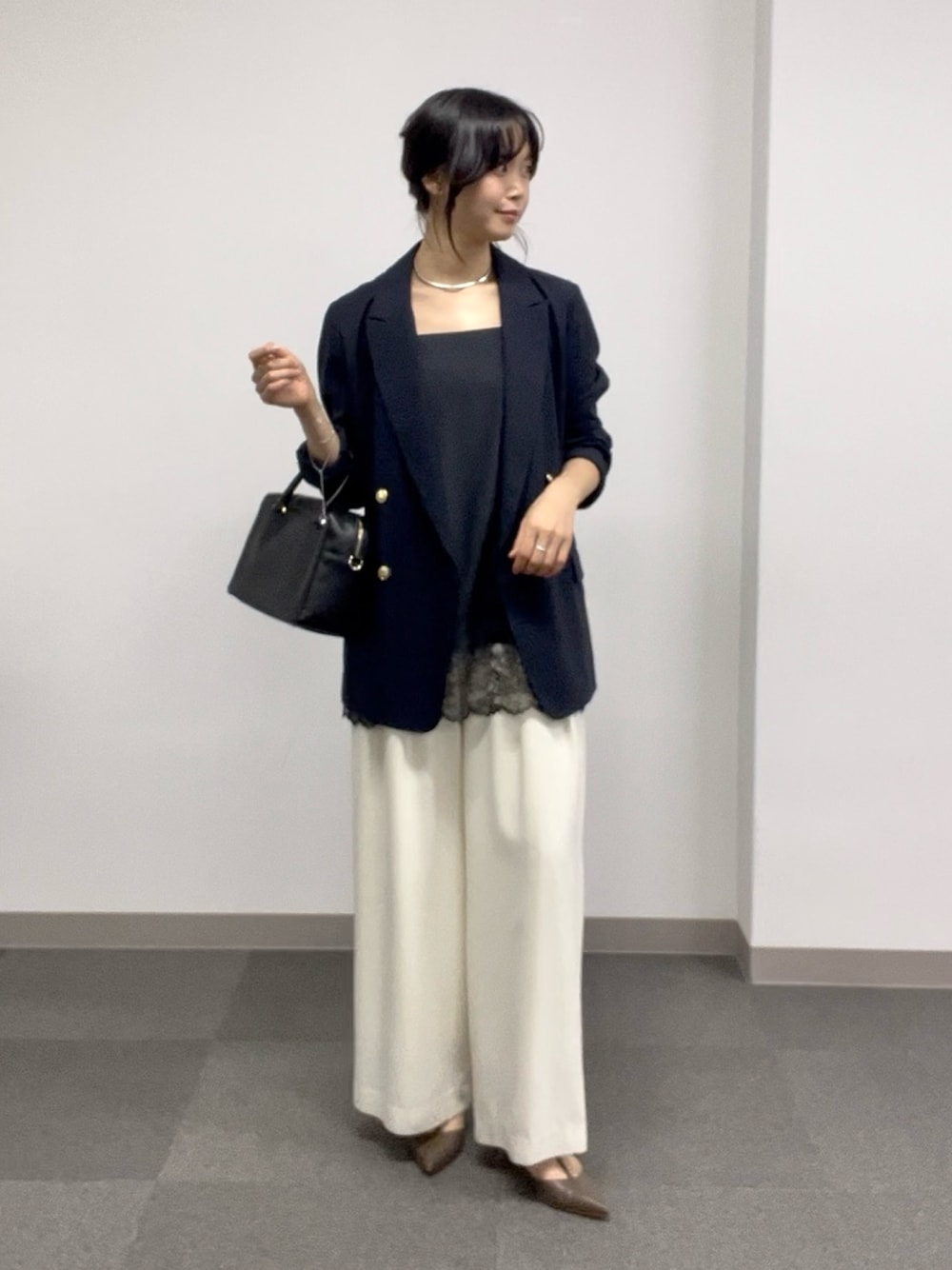 お仕事のジャケットコーデに、トレンドのレースキャミソールをレイヤード。 ほんのり華やかになりおすすめです