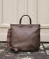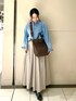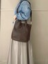 スリムデザインが魅力の2WAYトートバッグ。デニムシャツとダークブラウンのバッグがオトナリッチに!