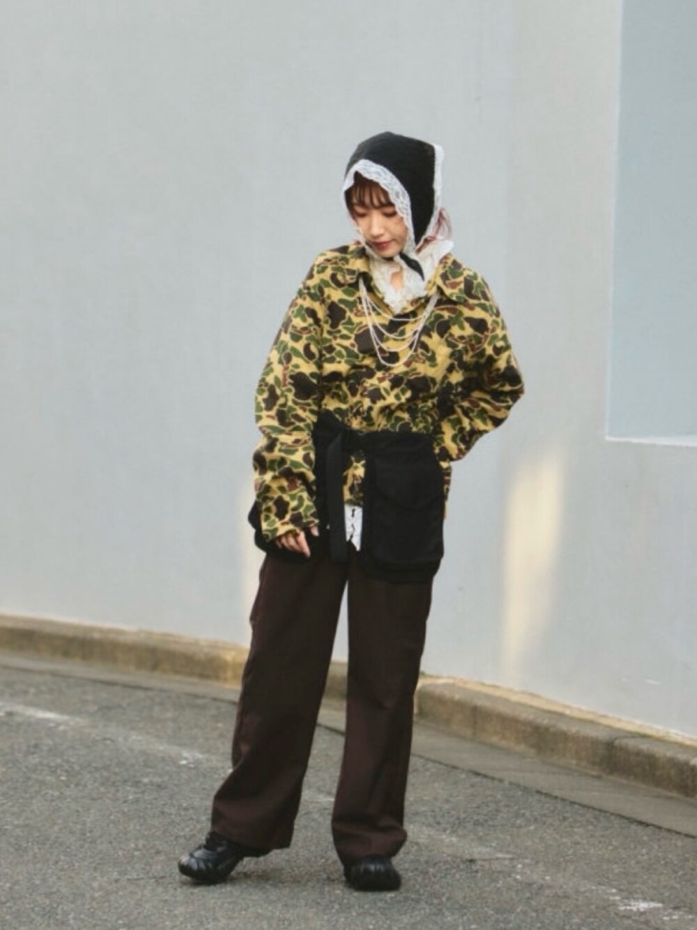 今年トレンドのバブーシュカ。 頭にそのまま巻いたり肩に巻いたり アレンジはいろいろ♡ kaoriからはレースつきの 可愛いデザインが出ているので ぜひチェックしてみてください! 私は甘くなりすぎないように ミリタリーで合わせてみました♪
