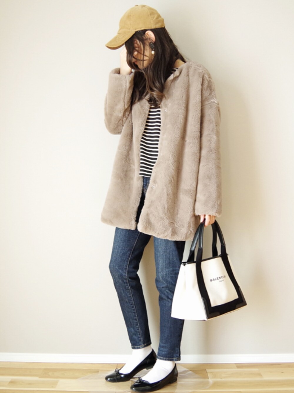 ZOZOデニム着回し。 数日前のGUアウターコーデからちょっと変えました。 select MOCAさんのエコファーコートで大人カジュアルに。 ピアスのパールがアクセントです。 instagram ☞ panawear77