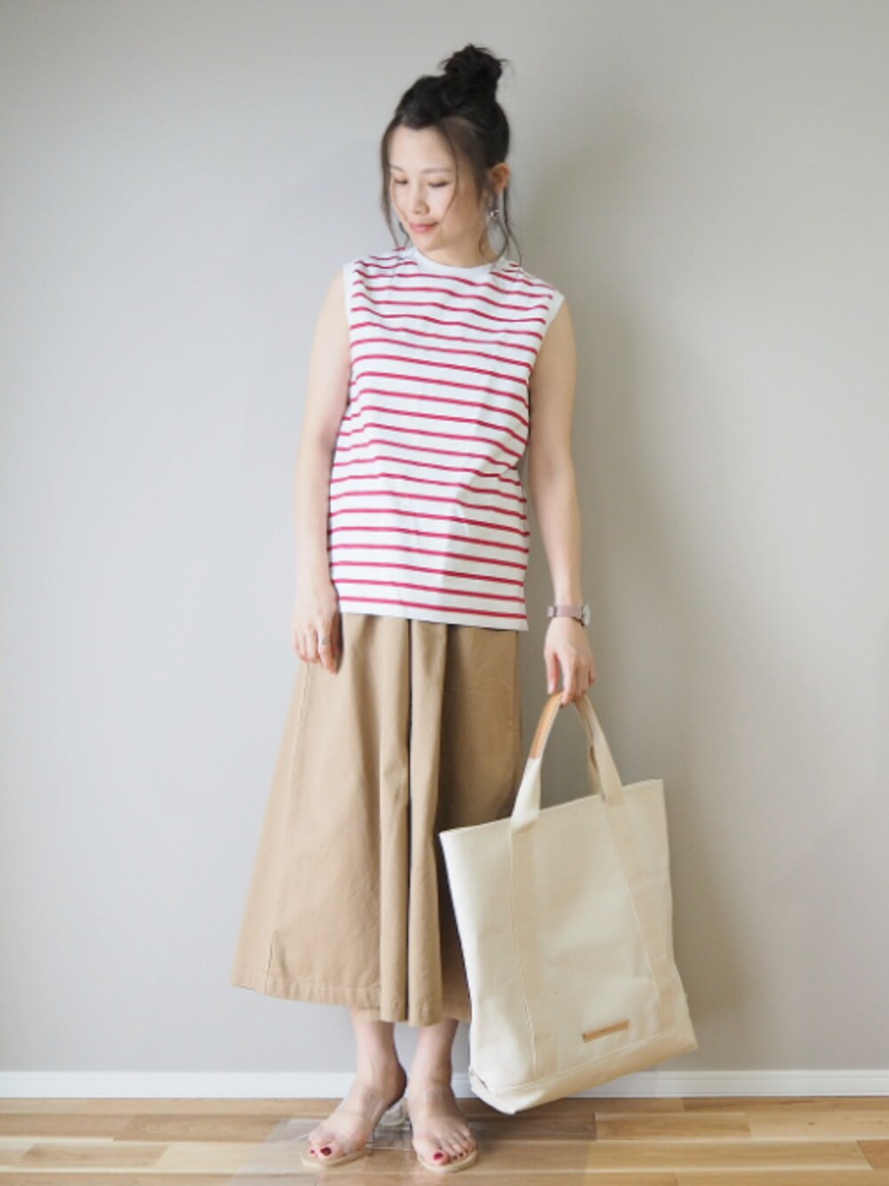#夏のボーダーフェス 元気になりそうな赤ボーダーは時々無性に着たくなる! Chaco closetさんのスカートみたいなワイドパンツとも相性バッチリです◎ instagram ⇒panawear77