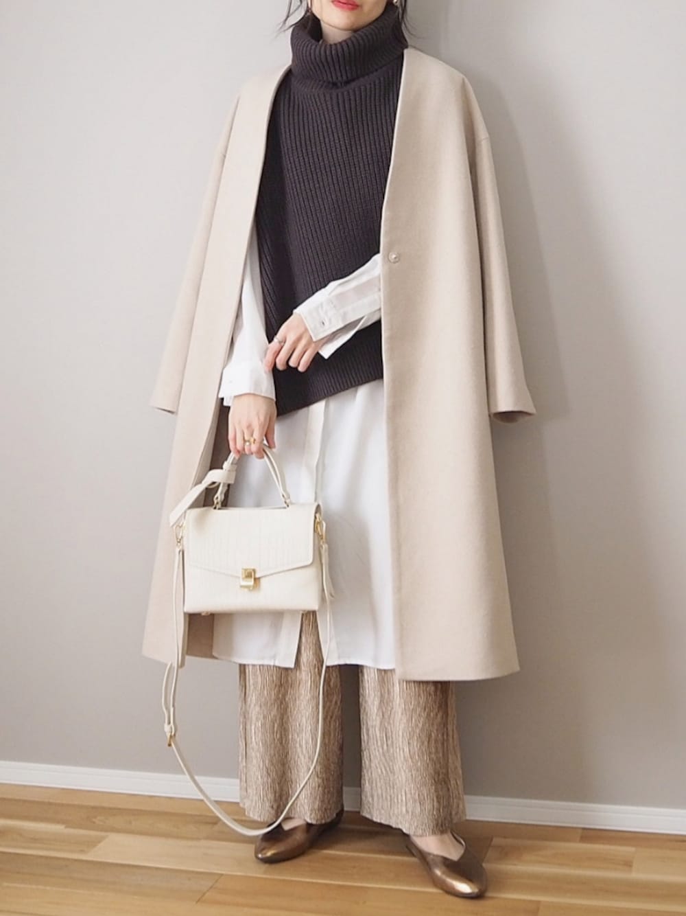 おはようございます🌿 見てくださりありがとうございます。 ▪°┄┄┄┄┄┄┄┄┄┄┄┄┄┄┄┄┄┄┄°▪ ◇ crie conforto 《アシンメトリータートルベスト》 リラックス感たっぷりのニットベスト。 アシンメトリーのデザインで 肩回りやサイドのデザインが左右違ってます♡ めっちゃ可愛い◎ シャツ以外にもいろんな合わせ方ができそうで 着回しが楽しみ♪ 《ウール混ノーカラーコート》 シンプルながらもドロップショルダーや落ちるシルエットで きれいに着られるノーカラーコート。 どんなコーデにも合うし、 ウール混なので防寒対策も◎ ボタンはひとつのみ、あまり見えないので、 すっきりと着られます♪ ベロアのパンツとゴールドのパンプスで 光沢感をプラスしました。 #pr instagram ⇒ panawear77
