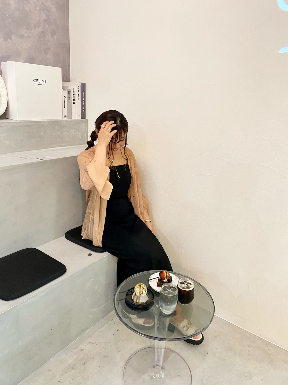 カフェコーデ𖠚ˎˊ˗ 雨の日☔️ 30℃ この日は雨だったので淡色じゃなくて黒に! ヘアアレンジもして可愛らしさも出しつつ服は大人っぽくしたꪔ̤̮♡︎ʾʾ