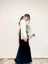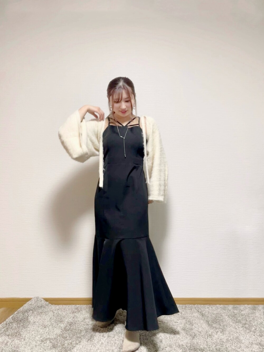 モノトーンカフェコーデ𖠚ˎˊ˗ 22℃☀️ マーメイドのキャミワンピが可愛い♥ ジャギーのボレロ、ふわふわやし、袖広がっててめっちゃ可愛いꪔ̤̮♡⸝⸝