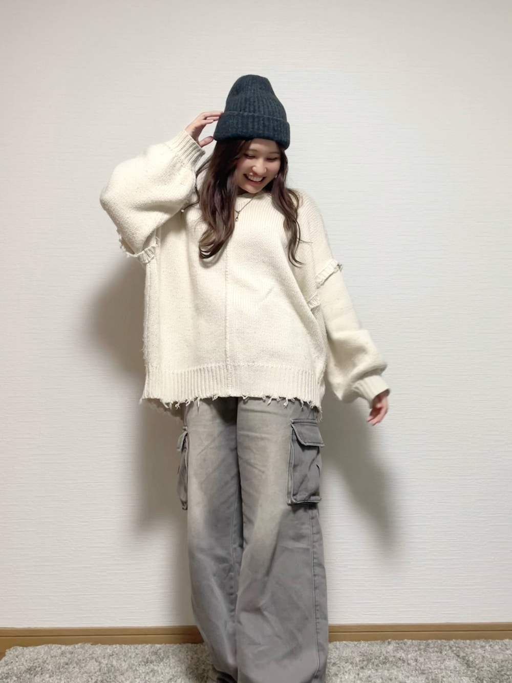 通学コーデ👣 19℃☀️ 今日はゆるっとコーデにっ♥ GUのニット帽可愛くてしかも素材も良くて最高すぎるˎˊ˗ ニット帽普段被らないけど似合ってるかな?ꪔ̤̮