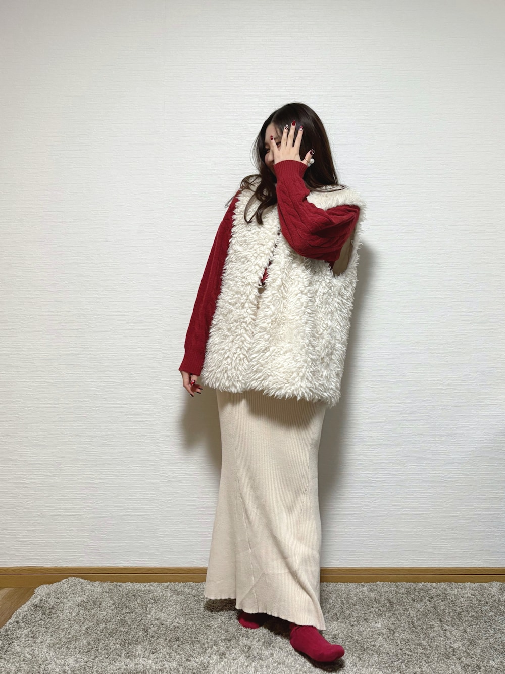 カフェコーデ♥ X’mas ver. 13℃☀️ ボルドー×アイボリーでサンタカラーに🎅🏻♥ クリスマスのネイルチップつけて カフェ巡りしてテンション上がってた🎄♡⸝