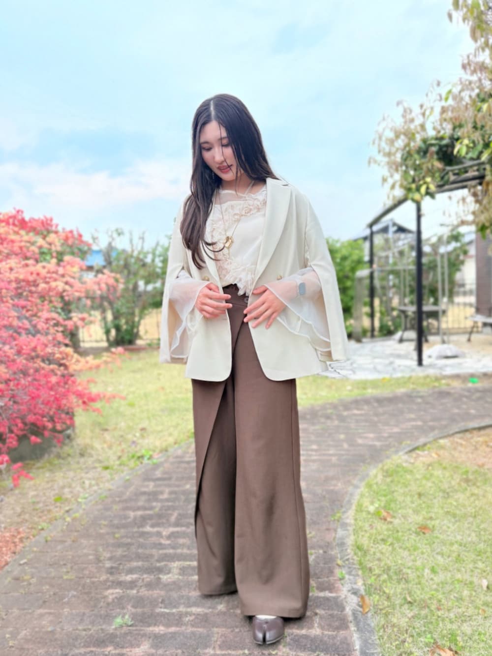 淡色キレイめコーデˎˊ˗ 21℃🌥️ ちょっと良いランチを食べに行ったので いつもよりもキレイめコーデに♥ˎˊ˗ ジャケットのこの袖がチャックであけられる スタイルが好きで一気にお洒落に🤎