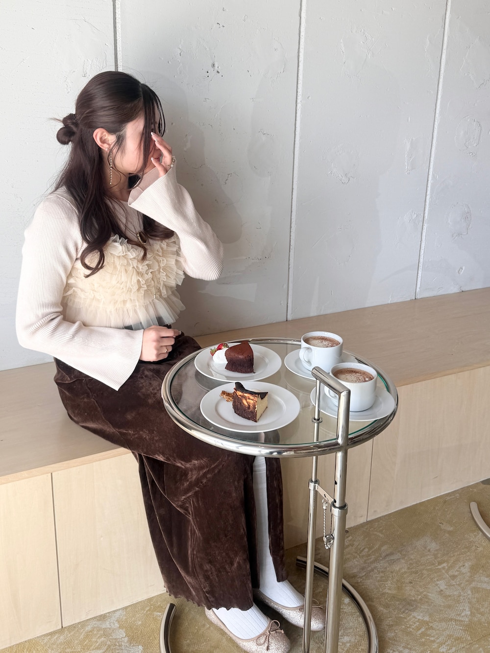 淡色カフェコーデ𖠚 12℃☀️ 淡色カフェに行く予定だったので、 アイボリー×ブラウンで淡色コーデにˎˊ˗ ビスチェを合わせてアクセントに!