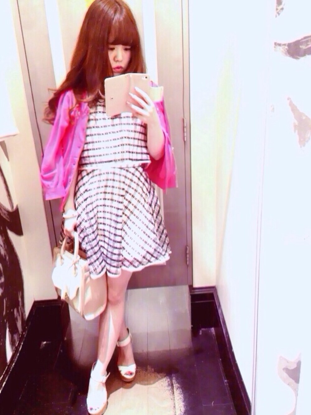 お出かけcode♡ グラフチェックオーガンジー素材の 存在感あるワンピースに ビジュー付カーディガンで色味をプラス しました。