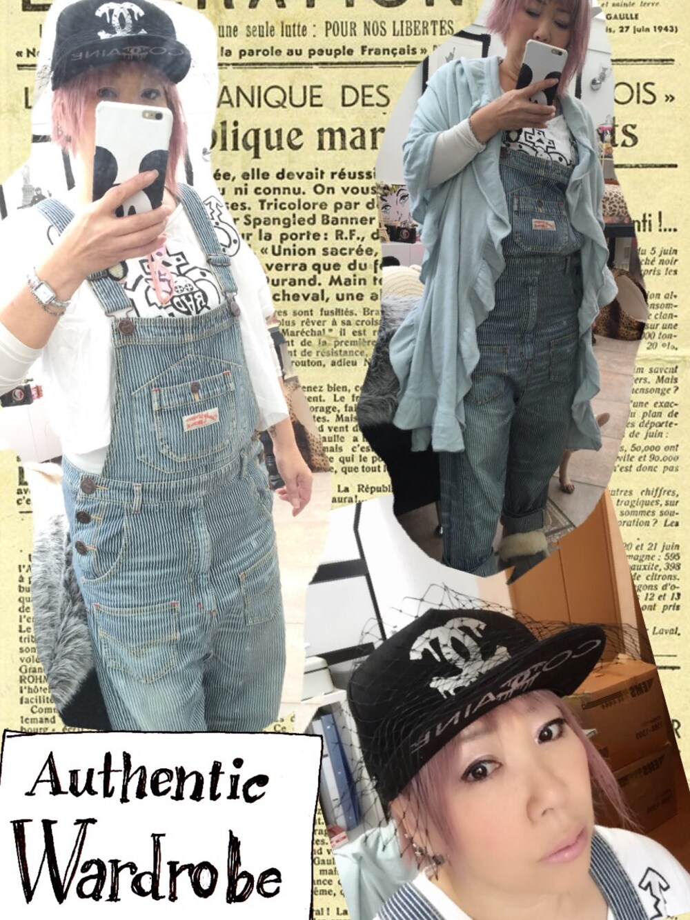 キャンディのヒッコリーオーバーオールにカシミアフリルのショール! カジュアル+甘さがポイント! キャップはネット付き!