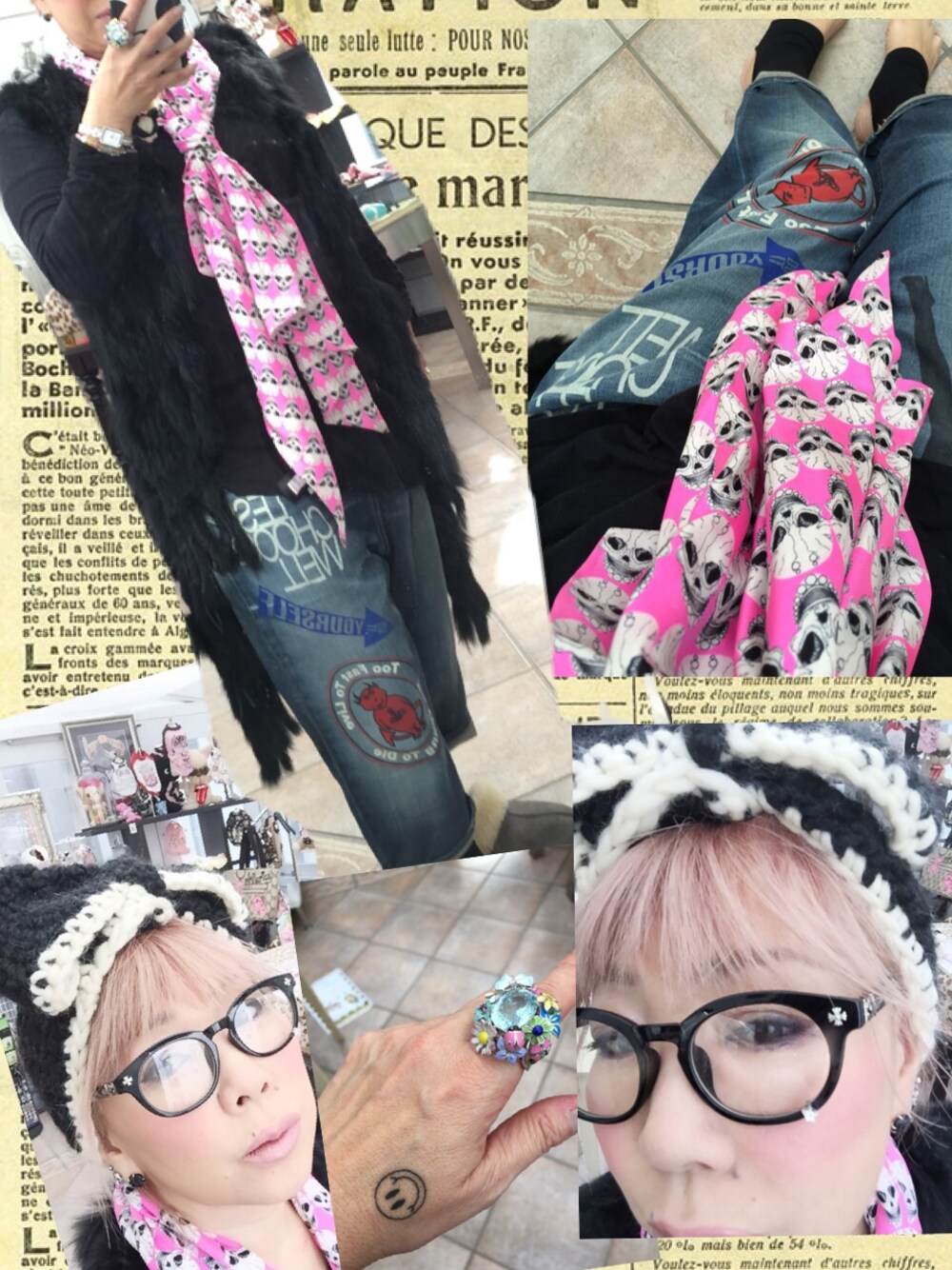 アングロマニアのデニムにファーベスト! ポイントはピンクのThomas Wylde のスカーフとWAKUWAKU select のターバン