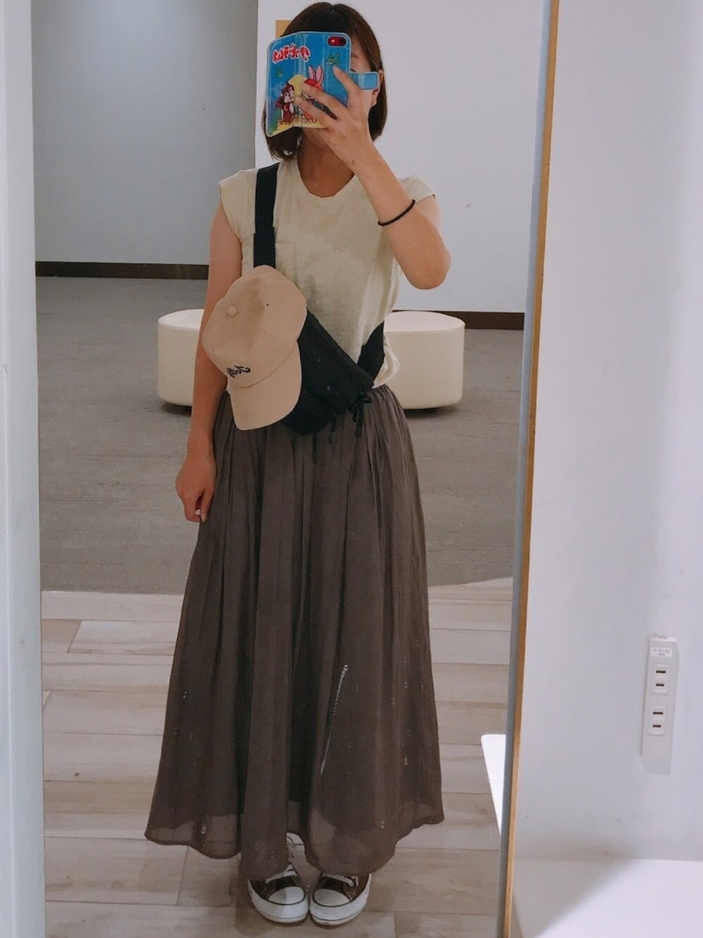 相変わらずのプチプラコーデ。 しまむらのキャップは300円w 少し秋を意識しつつも、まだノースリ。