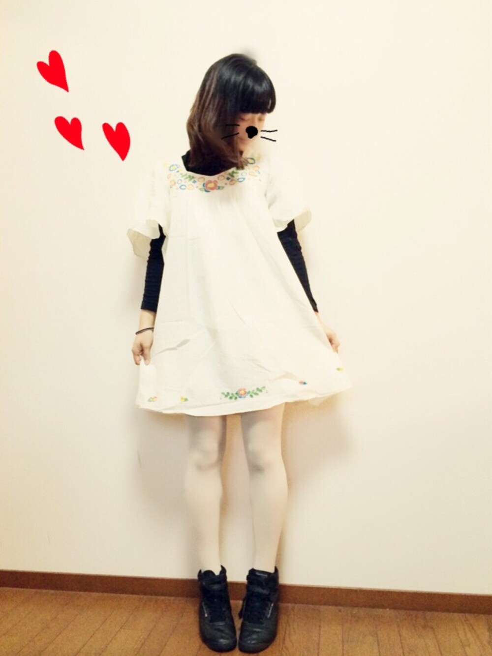 『どうも、春っぽい格好になりました』 インナーは黒のタートルネック、スニーカーは真っ黒 黒で締めました 締めた、、、 締めた、、、、、、、? p.s. 加工を、少しかわいいっぽくしてみたよ🙅⭐️