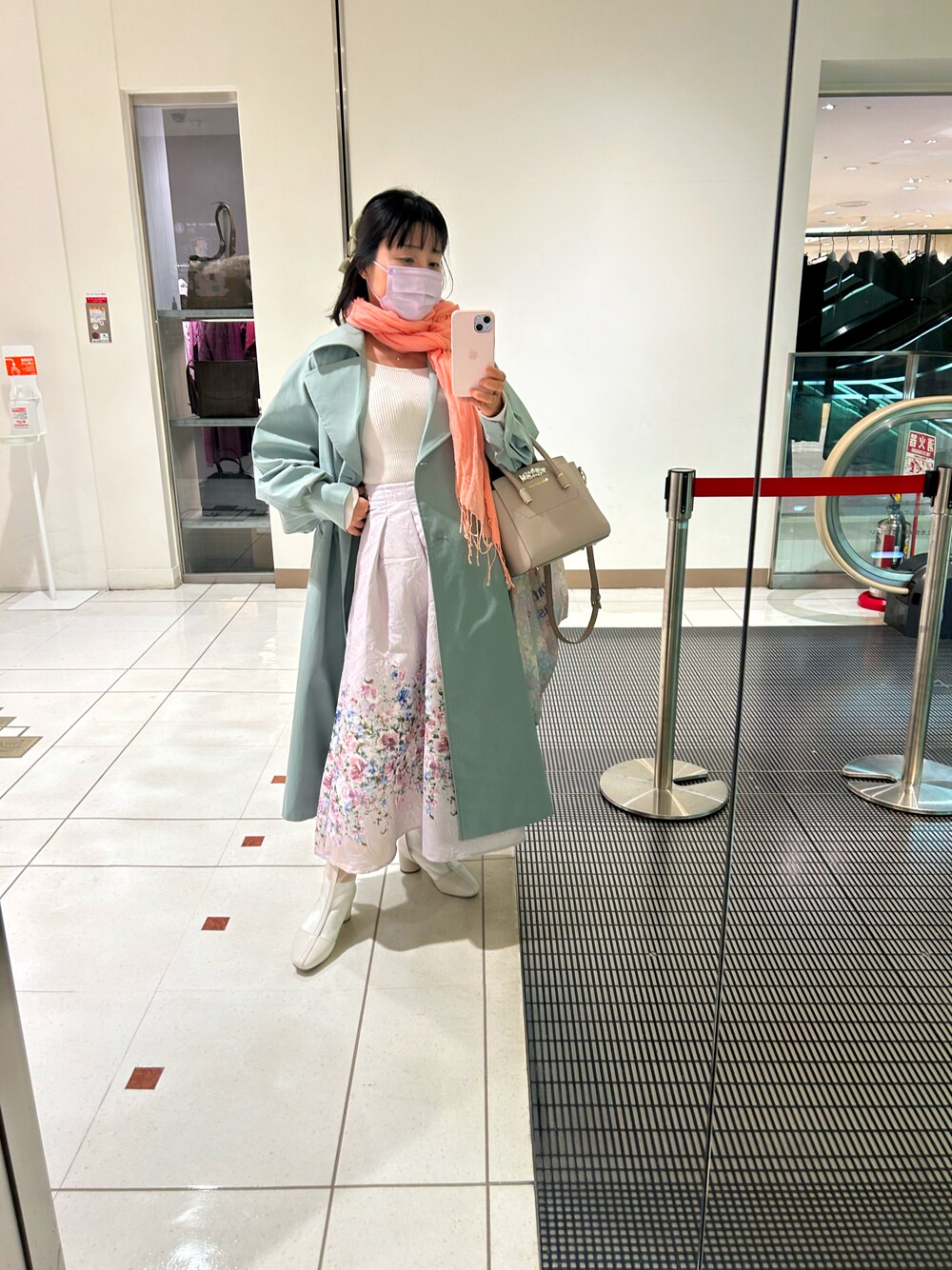 マジェスティックレゴンのメッシュブーツ ホワイトは、抜け感があって涼しくて良さげ🤭 ノーリーズの春コート トッコクローゼットの花柄ジャガードスカート ジルバイジルスチュアートのビジューつきバッグ