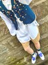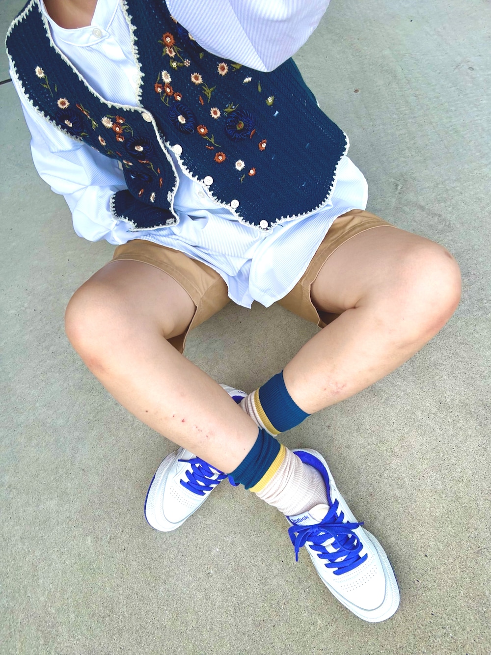 ブラウスとハーフパンツだけだとシンプルだから 古着のベストで色を入れてみたꕤ︎︎·͜· 靴下もカラーを合わせてブルー系🧦