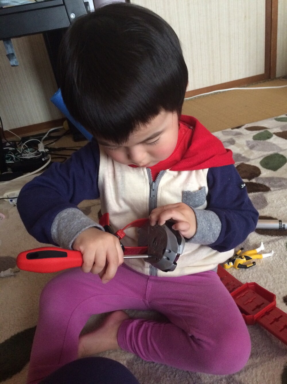 やっぱり 機械とかすきなんだよね(~_~;) ドライバーで頑張るが とれましぇーん。 春用のパーカーに ピンクパンツ。 パンツは青ペンで落書きしてます。 作業着です(^-^)
