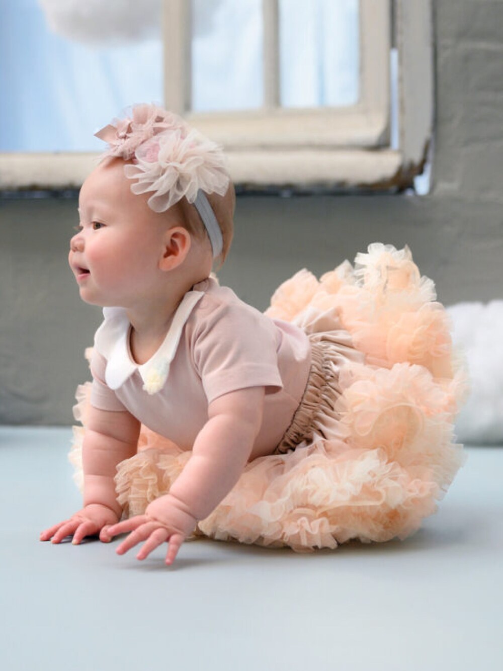 ハーフバースデーや1歳のお誕生日など、写真撮影に人気No.1コーディネート。チュチュスカートはサテン×コットンのリバーシブルで雰囲気を変えて楽しめるのも人気の秘密。