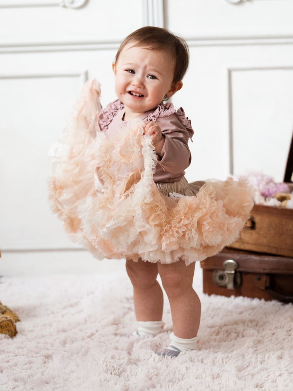 ベビーの愛らしい雰囲気を引き立てる、優しいベージュコーデ。チュチュカーニバルは上品さはもちろん、さまざまなコーディネートに取り入れやすいと人気です。