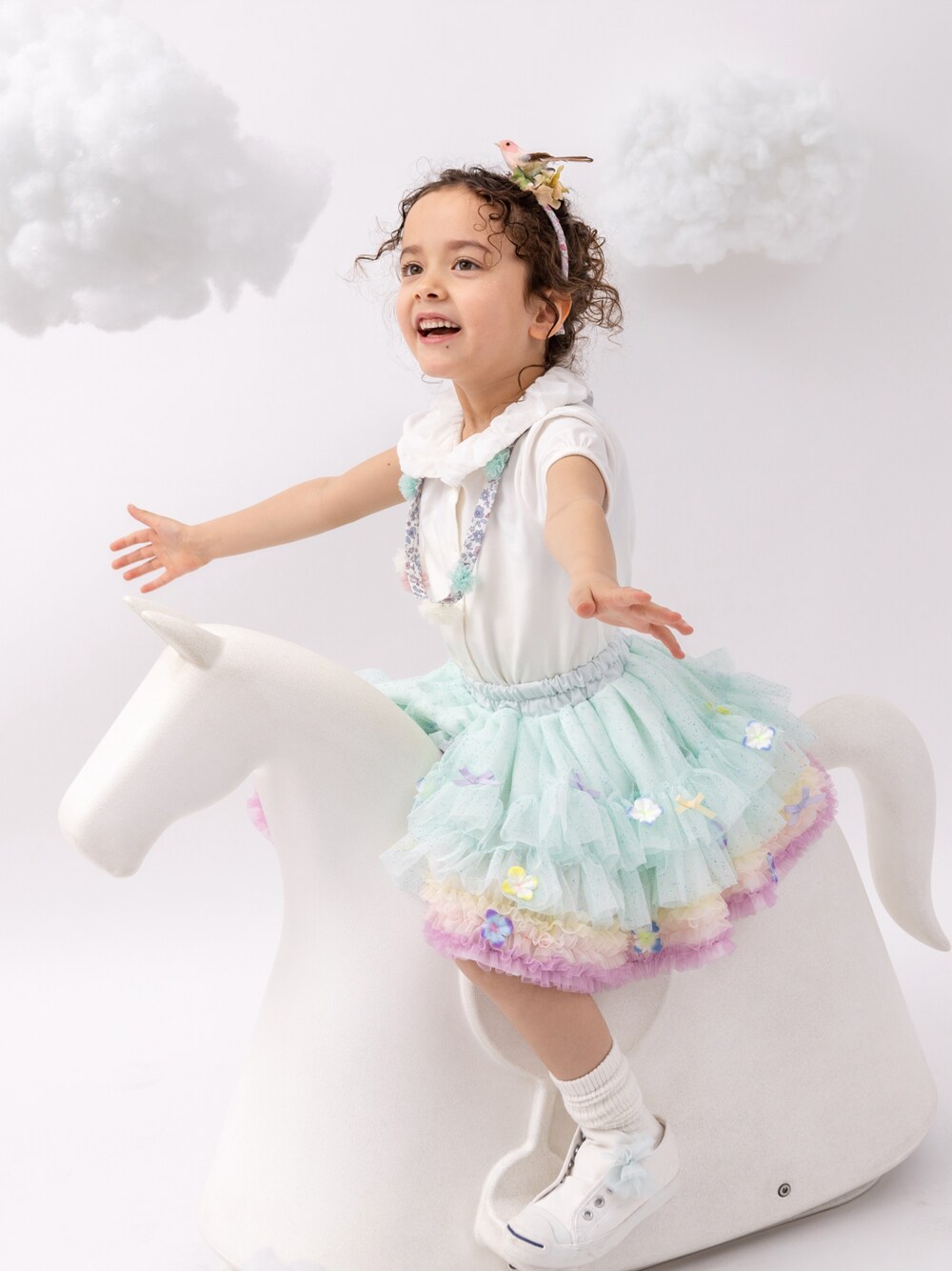 チュチュプリンセスはミントベースにラメがキラキラと輝いて物語の主人公に♪ ブラウスのふんわり襟をプラスして華やかに演出 お出かけコーデや特別な日におすすめ! ※モデル着用はデコチュチュverです。