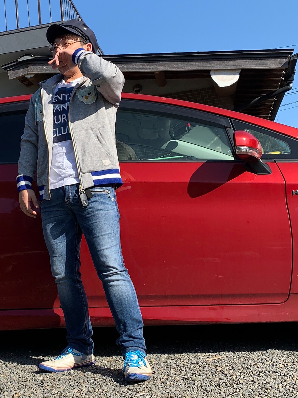 結局、半年以上寝かすことになってしまったパーカーを着たくて正直少し暑いけど来てお出かけ(笑) 主役のパーカーのカラーを軸に帽子やシューズを青系で(笑) 写真を見て気が付いたが綺麗に行きたいなら単色のスキニーデニム(青)のが良かったな(´Д`)カジュアルになりすぎかな(笑)まあいいや(笑)