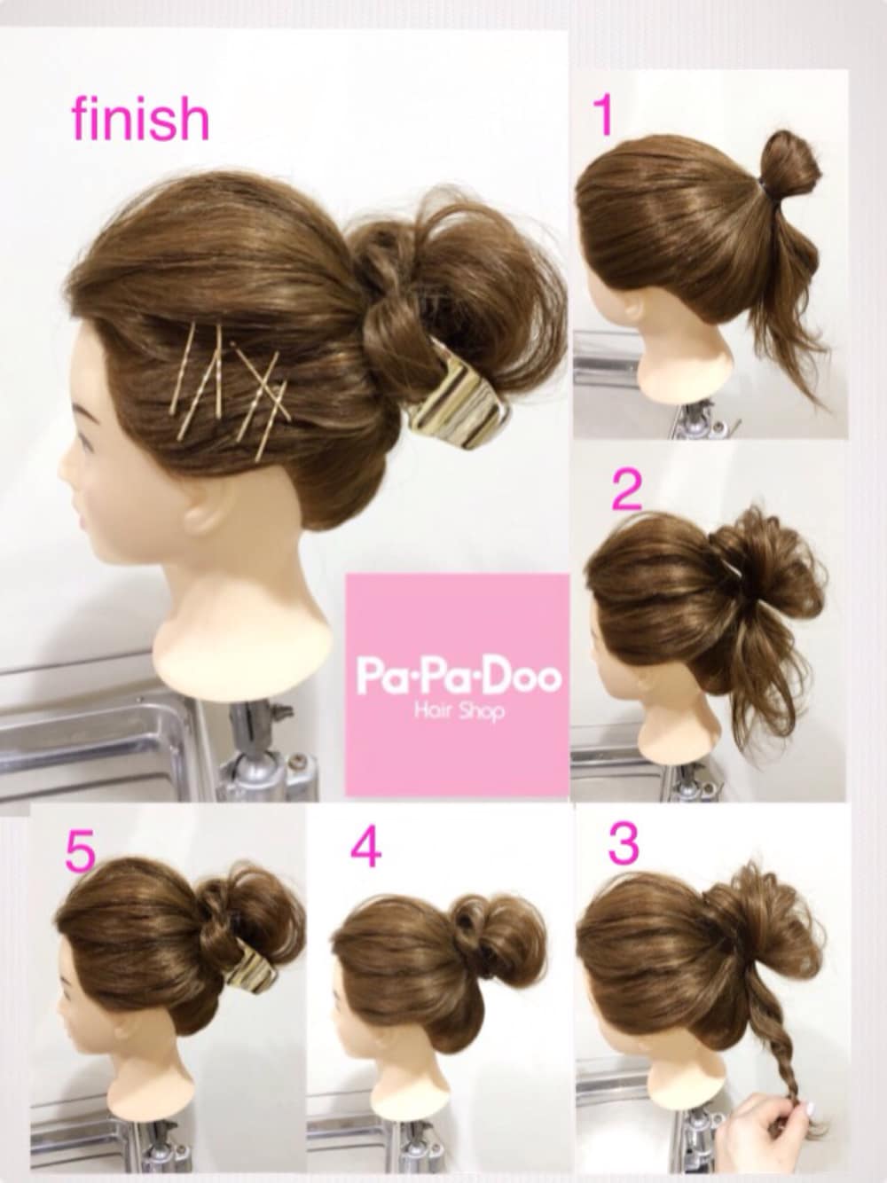 シニヨンおだんごアレンジ♡ 1.ループを作って縛ります。 2.引き出してくずします。 3.毛先をねじります。 4.ゴムのまわりに巻き付け、とめます。 5.クリップをバランスみてつけます。 ゴールドピンで遊べば完成です!! 💇💕