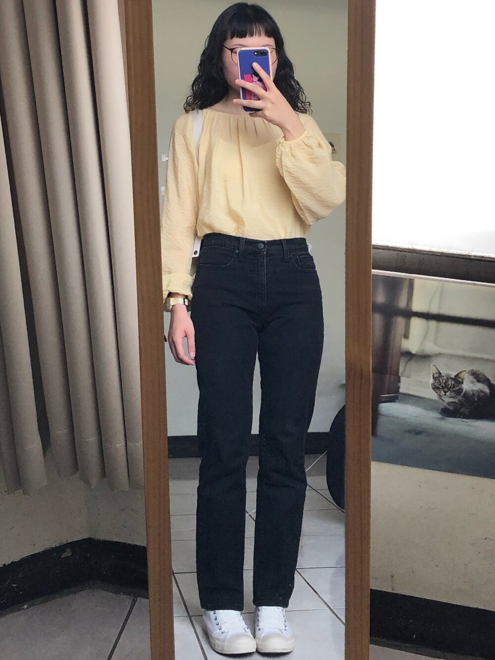 イエロー系のトップス、ブラック系のデニムパンツを着用したレディースの夏コーディネートの1枚目の写真