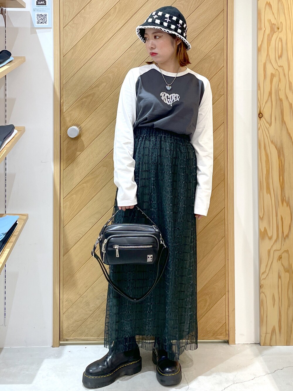151cm/普通体型/X-girl ボーイッシュスタイルに定番のラグランですが、ロングスカートとのコーディネートもとっても可愛いです! 首周りがしっかりしていて普段のX-girlのTシャツよりもすこし襟ぐりが狭いので胸元の開きが気になる方におすすめです。