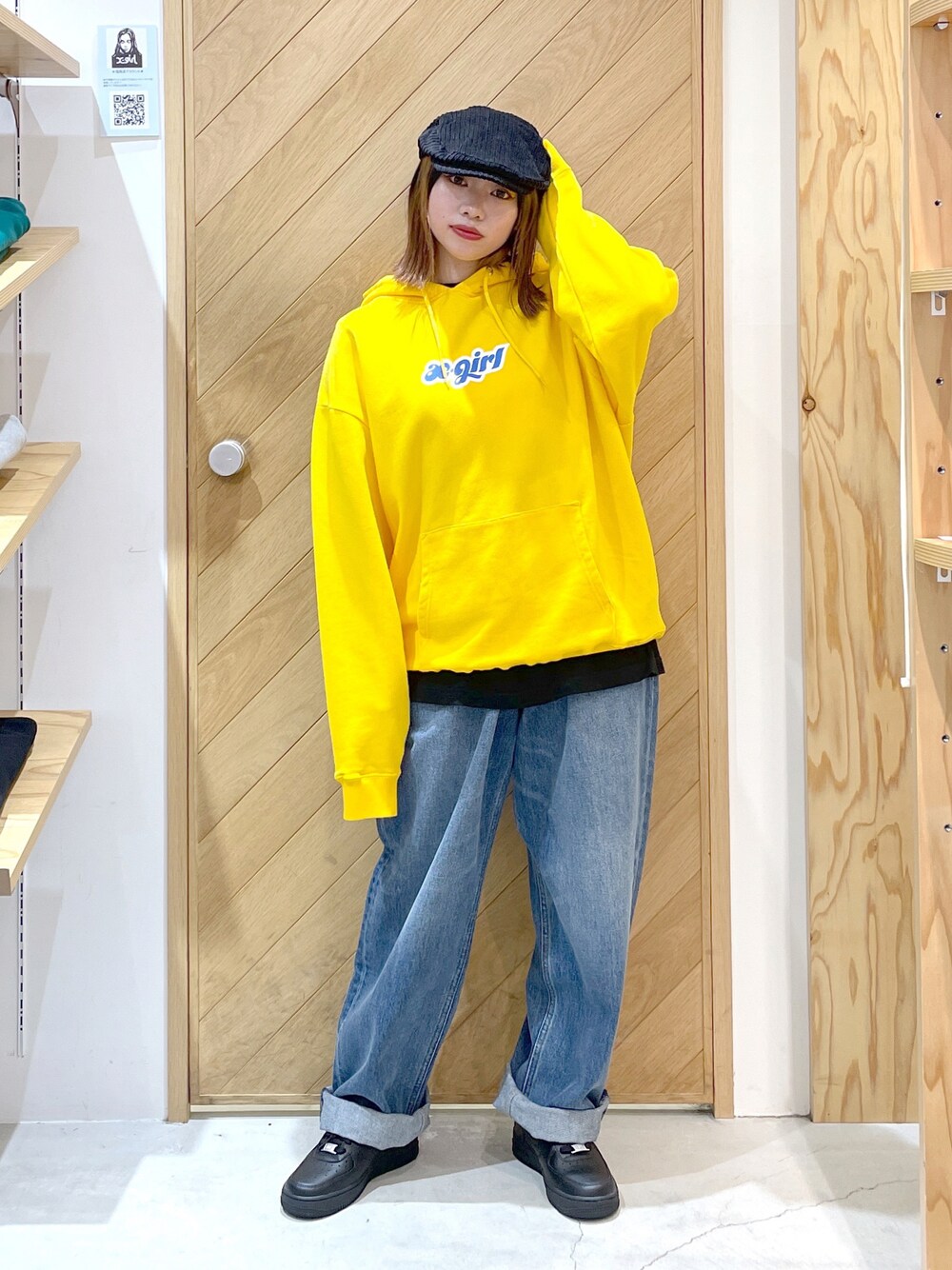 151cm/普通体型/X-girl 《普段着用サイズ 》 ・トップスM,XL ・ボトムスS ・足のサイズ 23.5cm 《今回着用サイズ》 ・フーディー M ・パンツ S ・インナー L ・帽子 ONESIZE ・スニーカー 23.5cm X-girl定番商品のワイドテーパードパンツはフロントにタックが入っているので、ストンとした形ではなく立体的なシルエットが出ます。 151cmの私がオーバーサイズのトップスを着ても綺麗なパンツのシルエットになります。 お尻、腰回りは幅が広く余裕がありますが、ウエストは大きすぎず小さすぎず程よくしまっているので、お腹出しもいいですしトップスをタックインするスタイルもいいですよ♡