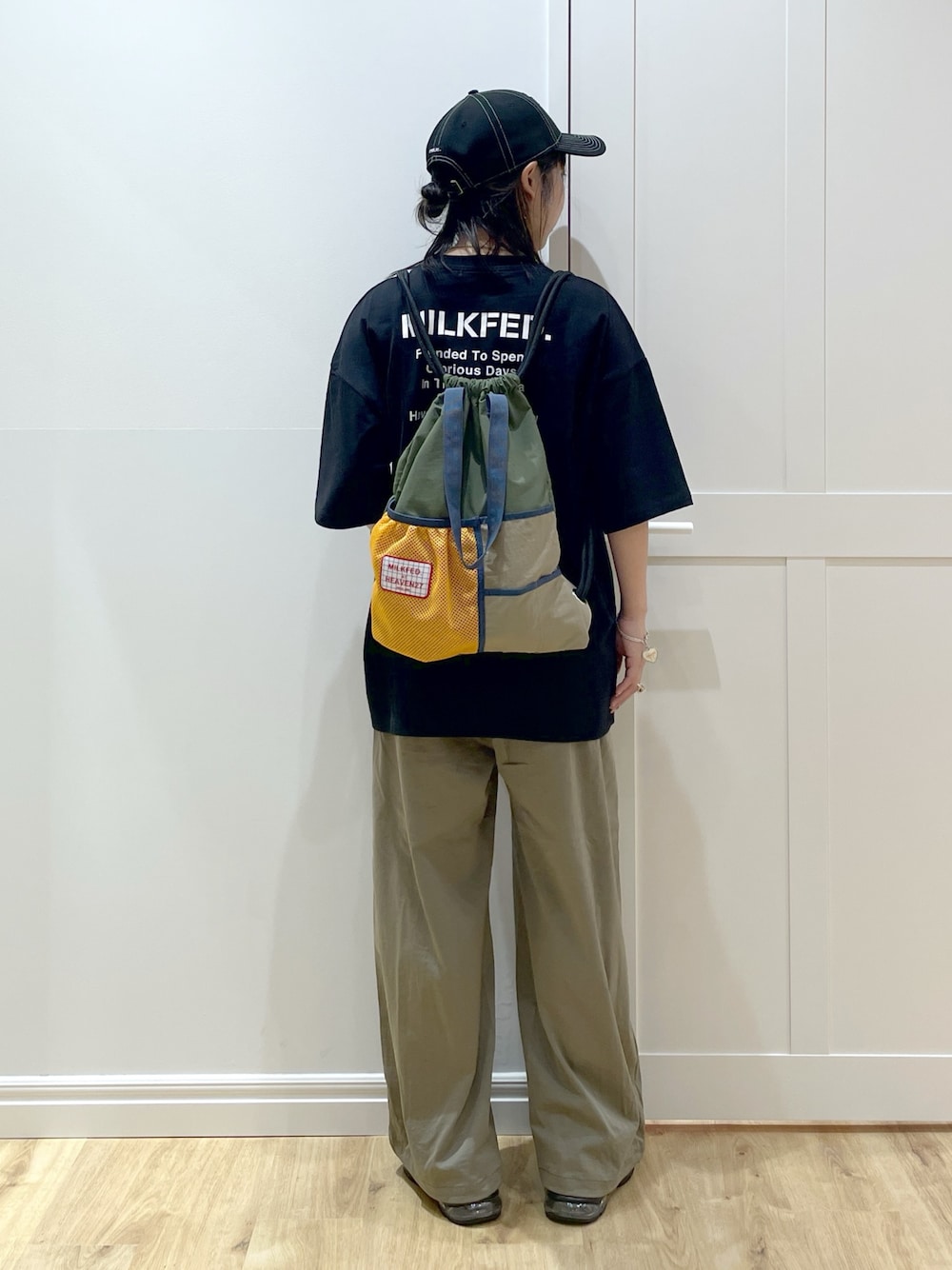 身長151cm/普通体型/骨格ストレート Instagram→@papi354_gg 《普段着用サイズ 》 ・トップスS,M,L ・ボトムスS ・足のサイズ 23.5cm 《今回着用サイズ》 ・Tシャツ ONESIZE ・パンツ S ・帽子 ONESIZE ____________________ 🧸トップス ⚫︎わたしの身長でもタックインした時にバックプリントが全部見えるのでバランスがとりやすいです🪽 ⚫︎お尻がすっぽりと隠れるくらいの丈です 🧸パンツ ⚫︎センタージップが付いていて他にないデザインです🦋 ⚫︎裾はドローコードがついているので私のような低身長でもスニーカーでコーディネート出来ます💖 ____________________