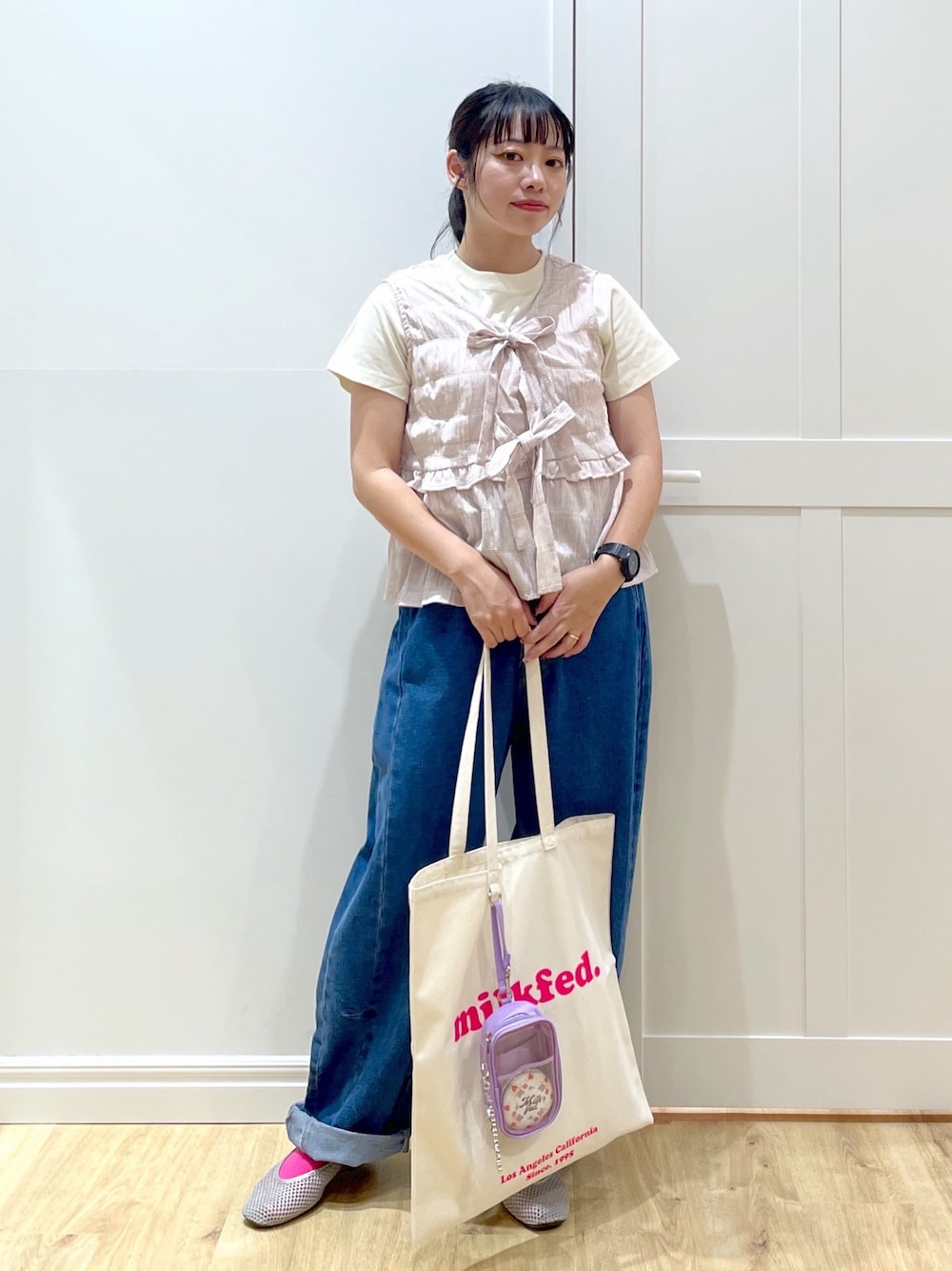 SAKI 🍣(MILKFED.福岡(ソラリアプラザ))のタンクトップ「RIBBON FRILL TANK TOP」を使ったコーディネート