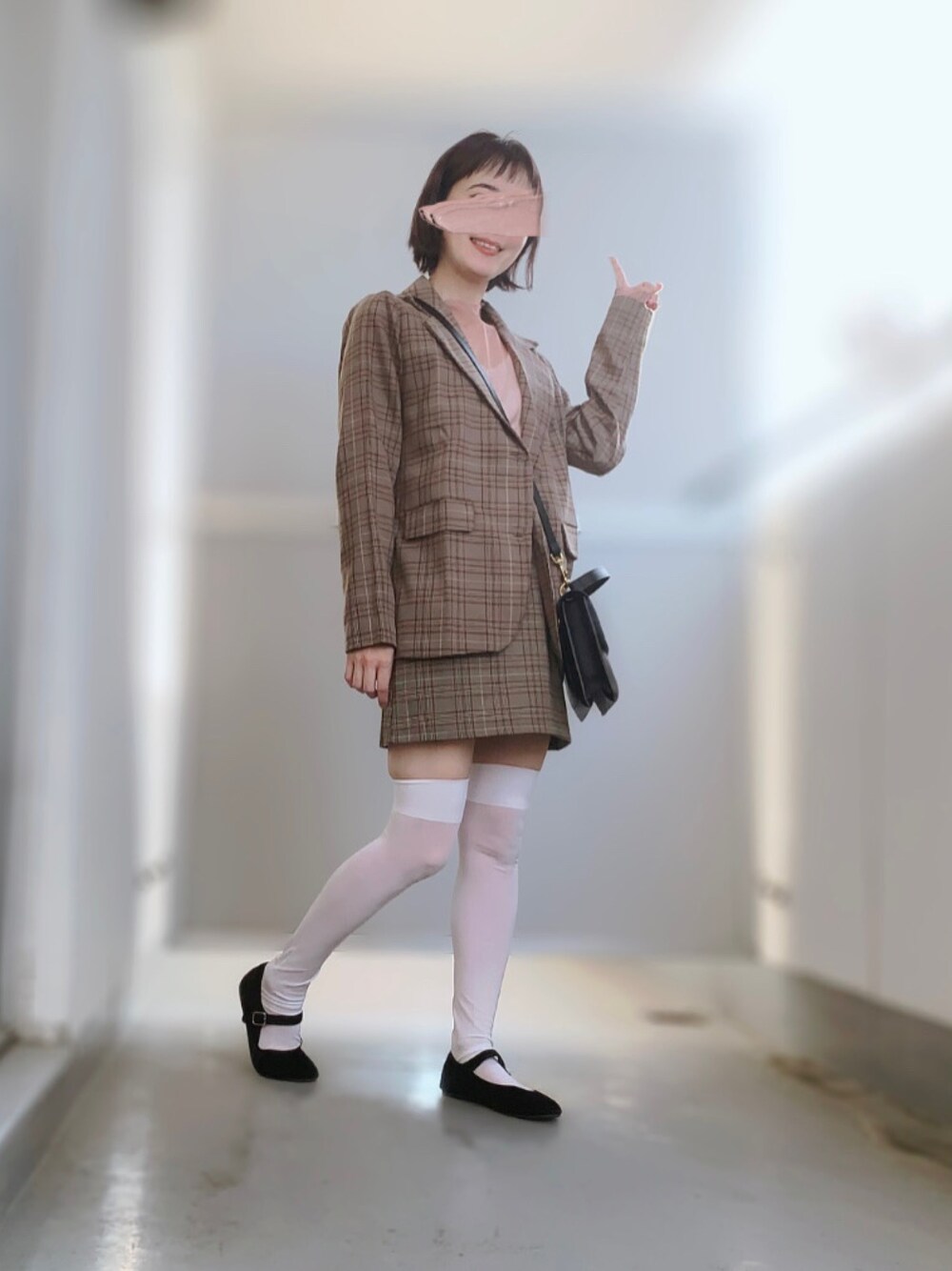 韓国通販したセットアップ✨ グレンチェックが可愛いです🥰 白のニーハイソックス買ってみました🤍 やり過ぎたな…😅 やっぱりハイソックスの方が大人っぽい💦