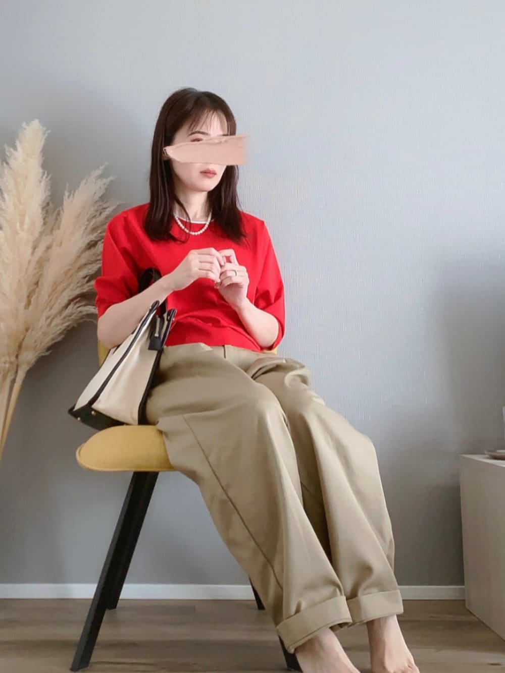 赤の半袖ニットを買いました❤️ 白のパイピングが可愛いです❤️ 朱色っぽいかと思ったら、結構トマトレッドだった🍅 夏でもあんまりTシャツを着ない私💦